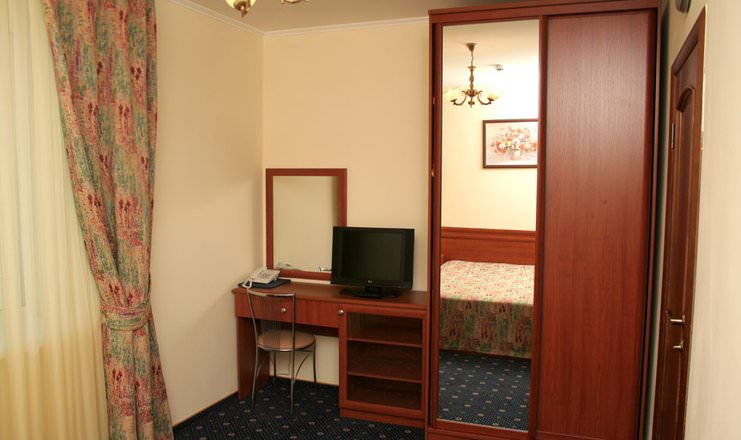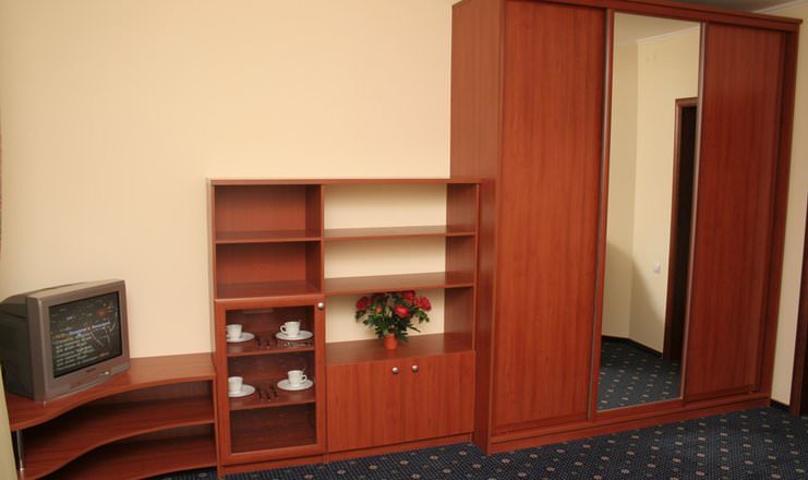 В гостиной есть мягкая мебель, телевизор, чайник, холодильник и набор посуды. В спальне стоит шкаф, столик, телевизор и две кровати.
